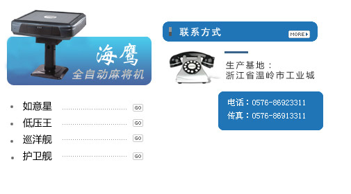 海鹰企业座落于美丽的东海之滨--浙江温岭,是一家专业从事全自动麻将机研发、生产、销售和服务的知名麻将机企业。海鹰企业拥有专业的技术研发团队,引进了高标准的现代化生产制造体系,以现代化的经营管理、设计理念,致力于打造高品质的麻将机产品。2009年海鹰企业.....